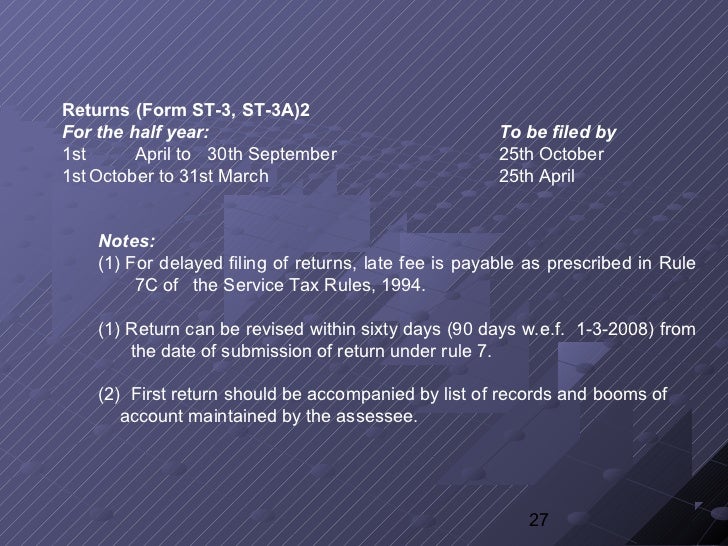 Theassessees can filethe return either onlineoruse the offlineutility The last date offiling the ST-3 return for the said period is 25th October, late fee, payable in terms of Rule 7 C of Service Tax Rules, 1994. 3. ... Access Content